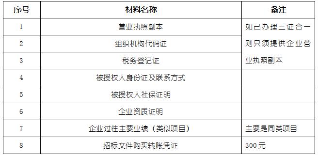 2、 凡有意向参加投标者,请在上述期间内按下表提供报名资料,相关证明文件的原件如无法提供原件则提供复印件加盖公司公章,投标人须将上述资料的扫描件发邮件至招标联系人处进行报名。