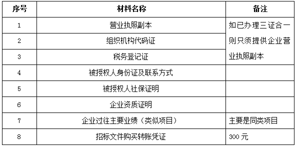 2、 凡有意向参加投标者,请在上述期间内按下表提供报名资料,相关证明文件的原件如无法提供原件则提供复印件加盖公司公章,投标人须将上述资料的扫描件发邮件至招标联系人处进行报名。