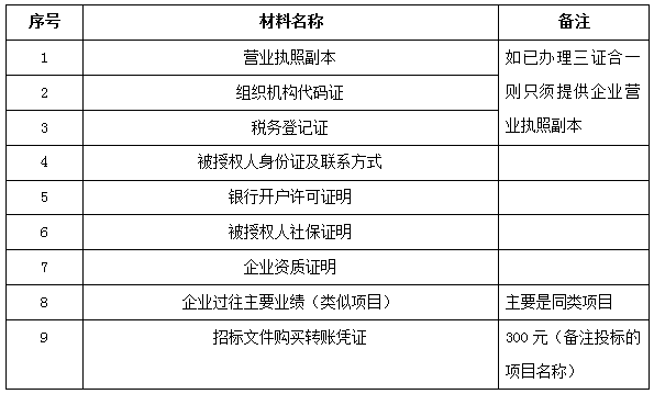 2、 凡有意向参加投标者,请在上述期间内按下表提供报名资料,相关证明文件的原件如无法提供原件则提供复印件加盖公司公章,投标人须将上述资料的扫描件发邮件至招标联系人处进行报名。