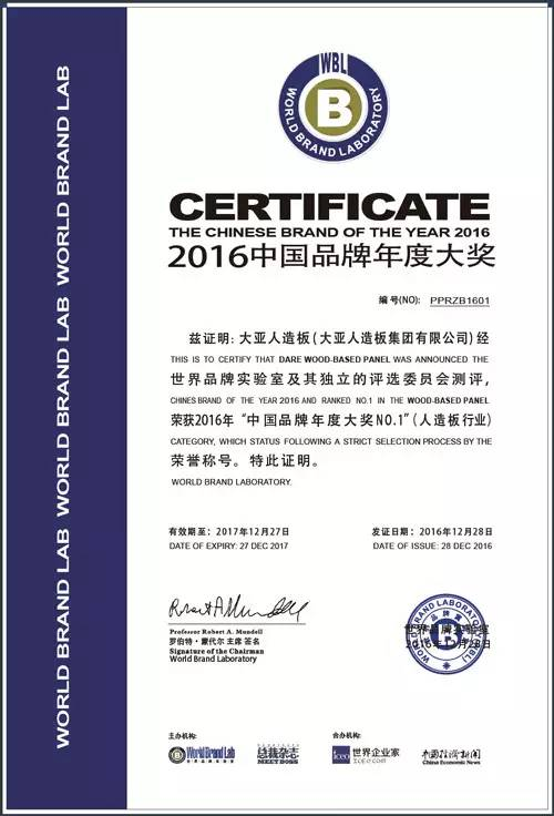 由世界经理人集团 (icxo.com) 、世界品牌实验室、《世界企业家》、《总裁》杂志、世界媒体实验室联合主办的“总裁世界年会”于2016年12月28日在北京隆重召开,会上发布了2016年度的“中国品牌年度大奖”、“中国经济年度风云人物”、“五星钻石奖”及"世界媒体500强"等奖项。鉴于大亚人造板市场知名度、美誉度、偏好度、创新力及多年来在中国行业里的地位和影响力,经世界品牌实验室及其独立的评选委员会测评,授予大亚人造板(大亚人造板集团有限公司)2016年“中国品牌年度大奖NO.1”(人造板行业)荣誉称号。大亚人造板集团副总裁仲宏年代表集团接受荣誉奖牌。